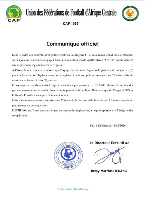 Les qualifications pour la CAN U17 2026 connaissent leur premier incident en Afrique centrale. Le match d’ouverture entre la RDC et la Guinée équatoriale a été annulé après la détection de six cas de fraude sur l’âge lors des tests IRM, selon un communiqué de l’Union des fédérations de football d’Afrique centrale. Le règlement de la compétition autorise un maximum de trois joueurs non éligibles par équipe.