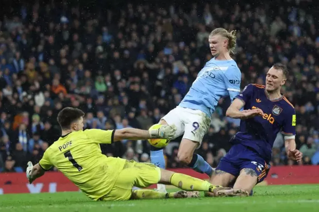 | L’attaquant norvégien de Manchester City, Erling Haaland, bute sur le gardien de Newcastle Nick Pope samedi lors du match de Premier League à l’Etihad Stadium de Manchester. |