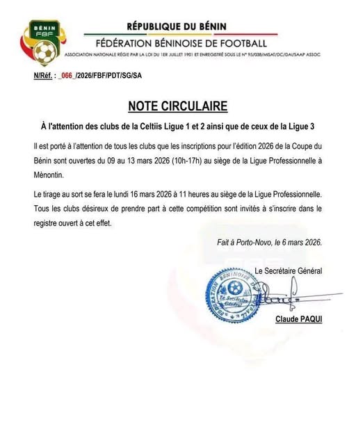 La Fédération béninoise de football informe les clubs des Ligue 1, Ligue 2 et Ligue 3 que les inscriptions pour l’édition 2026 de la Coupe du Bénin sont ouvertes du 9 au 13 mars 2026, de 10h à 17h, au siège de la Ligue Professionnelle à Mènontin. C’est à travers une note circulaire, datée du 6 mars 2026 à Porto-Novo, et signée par le Secrétaire Général de la Fédération, Claude Paqui.