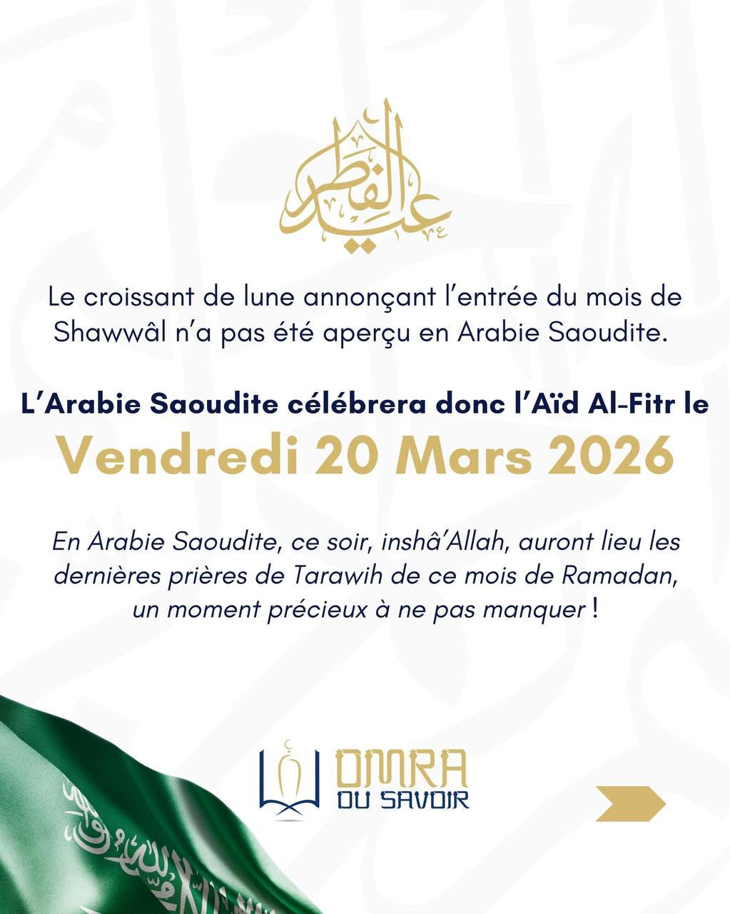 AccueilSport & CultureArabie Saoudite : l’Aïd al-Fitr fixé au 20 mars 2026 Arabie Saoudite : l’Aïd al-Fitr fixé au 20 mars 2026 Kaweru Infosil y a 1 heureMoins d'1 min Le croissant de lune qui annonce l’entrée du mois de Shawwâl n’a pas été aperçu en Arabie Saoudite, ce mercredi… Tags:20 mars 2026Aïd al-FitrArabie Saoudite Shares: Article PrécédentFrance – DZ Mafia : quatre nouvelles mises en examen pour projets d’actions violentes à Marseille Dans la même catégorie Bénin : la « Cité lacustre de Ganvié » classée au patrimoine culturel national Kaweru Infosil y a 2 semaines Tirage au sort du Mondial 2026 : chaîne et heure pour suivre la cérémonie Kaweru Infosil y a 3 mois Mondial 2030 : Akhannouch met en avant le leadership du Maroc à l’ONU Kaweru Infosil y a 6 mois