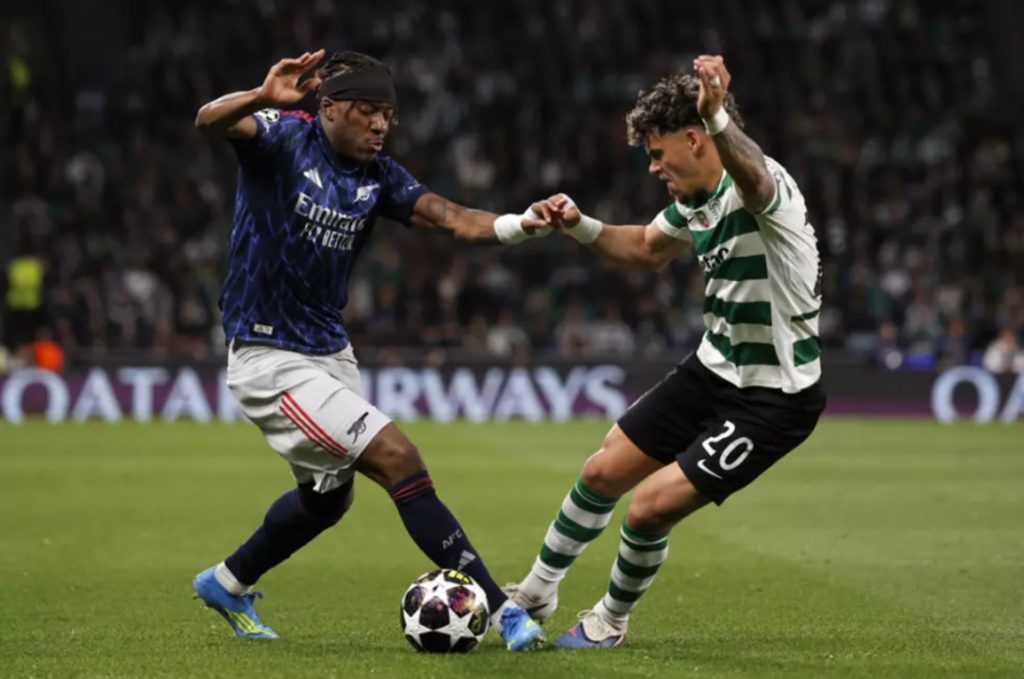 Noni Madueke (gauche) d’Arsenal aux prises avec Maximiliano Araujo du Sporting Portugal lors de la victoire des Londoniens 1-0 en quart de finale aller de Ligue des champions, le 7 avril à Lisbonne.